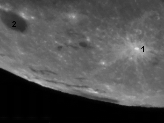 Rechts ist der helle Krater Byrgius (1) und links der dunkle Krater Grimaldi (2) zu sehen. Zwischen beiden nahe des Mondrandes befindet sich das Mare Orientale.