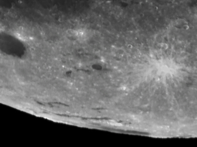 Durch die günstige Libration (Länge = -6.95° und Breite = -5.29°) sind diese Mondformationen nahe des Mondrandes zu sehen. Das dunkle Gebiet des Mare Orientale liegt bereits auf der Mondrückseite.