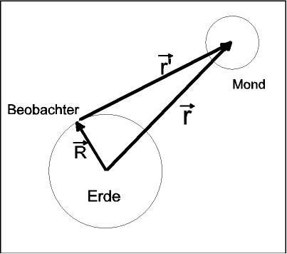 r' ... topozentrische und r ... geozentrische Koordinarten, R ... Ort des Beobachters