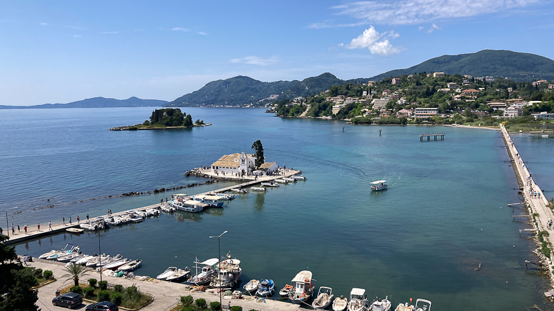 Pontikonisi. Beides sind häufige Fotomotive. Das kleine Kloster wurde im 17.Jahrhundert