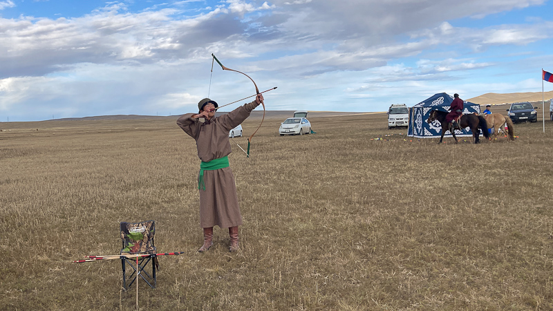 Eigentlich wird Naadam vom 11. - 13. Juli in der Hauptstadt zelebriert, aber auch zu besonderen Ereignissen und religiösen Anlässen wird Naadam in jedem Dorf hauptsächlich im Sommer veranstaltet. Neben gutem Essen werden auch die drei Lieblingssportarten der Mongolen durchgeführt; Ringen, Bogenschießen und Pferderennen. Nach dem Ringen sahen wir auch ein Pferderennen und Bogenschützen. Im Bogenschießen konnten wir uns auch selbst testen.