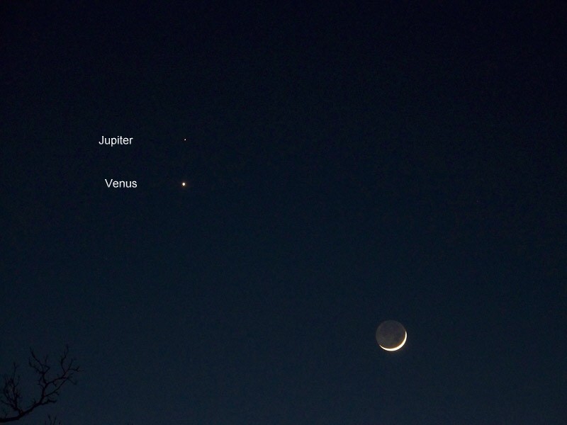 Links über der schmalen Mondsichel mit aschgrauem Licht sind unsere Nachbarplaneten Venus und der zur Zeit lichtschwächere Mars zu sehen. Aufgenommen mit der Digitalkamera "Kodak Z712 IS"