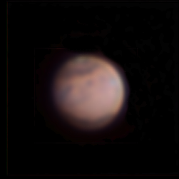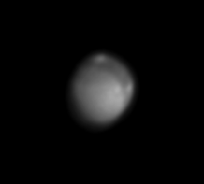 Eine andere Bearbeitung der gleichen Aufnahme, die Wolke bei Olympus Mons ist nicht so deutlich zu erkennen, durch geringere Schärfung aber eine natürlichere Darstellung.