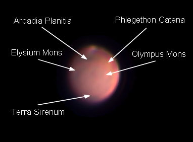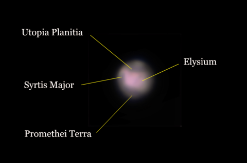 Einige Formationen sind im unteren Bild gekennzeichnet. Mit Elysium Mons ist der hellere Fleck nahe des Terminators gemeint.