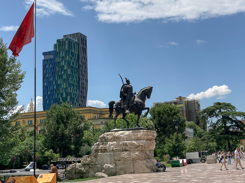 Das Skanderbeg-Denkmal in Form einer Reiterstatue wurde 1968 zum 500.Todestag des Volkshelden errichtet und steht in der Mitte des Platzes.