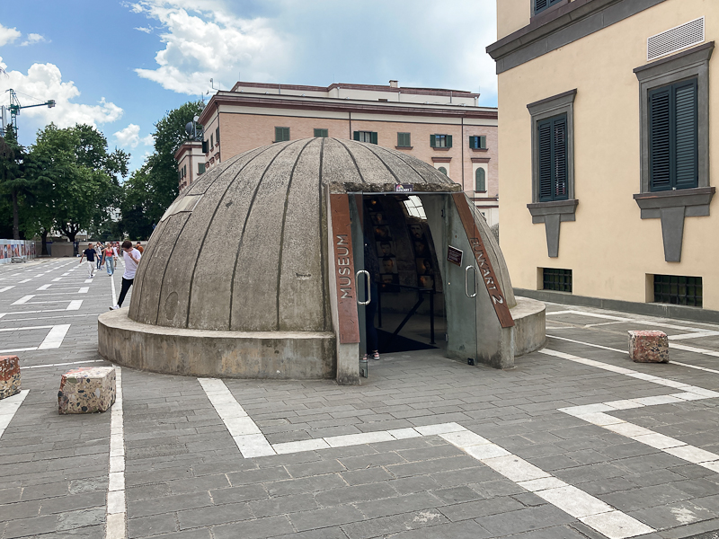 Wir besuchten Bunk‘ Art 2 als typisches Beispiel für die in Albanien allgegenwärtigen Bunker, die der Diktatur Hoxha zum Schutz der Bevölkerung bauen ließ. Er steht hinter den Ministerien. 750 000 derartige Bunker gab es im Land, die jeweils für 4 – 5 Personen Platz boten.