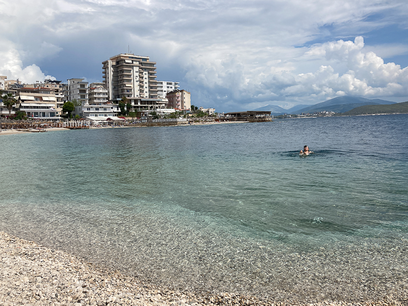 Nach unserem Ausflug hatten wir die Gelegenheit, in Saranda am Hotel zu baden. Der Steinstrand ist typisch für das Ionische Meer. Das Hotel verfügt über einen eigenen Strand.