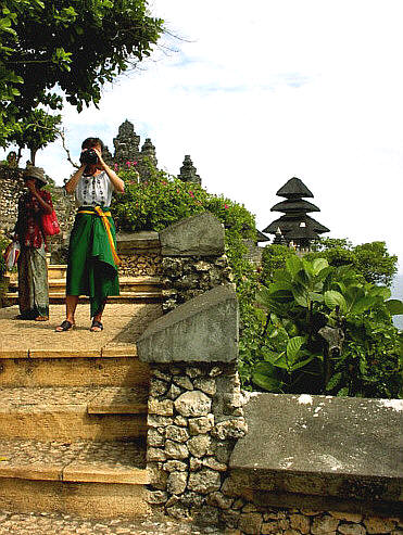 "Affentempel" Ulawatu Auf der Halbinsel Bukit wird der Tempel Ulawatu nicht mehr als solcher benutzt, sondern von den heiligen Affen bewohnt. Beim Besuch muß man auf persönliche Dinge, wie Brillen, Kameras u.a. achten. Die Affen sind sehr geschickt im Klauen. Wie bei allen Tempelbesuchen sind die Knie mit einem Sarong zu bedecken - zur sorgfältigen Trennung von Ober- und Unterkörper. Zur weiteren Kleiderordnung gehört der Tempelschal (selendang). Beides kann man sich ausleihen.