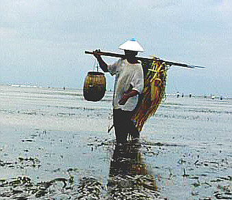 Beim Angeln und Fischen sind die Balinesen oft mehrere Stunden mit Kleidung im Wasser; hier nach dem Fischen: