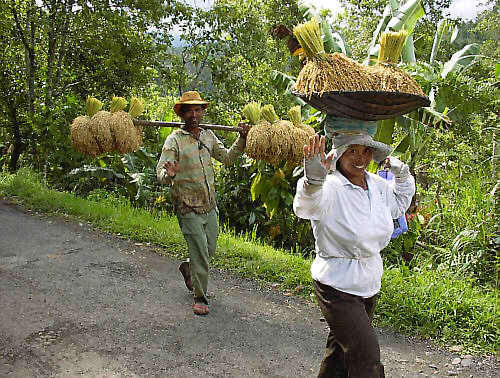 Balinesen (1) Tradition und Touristik - in Bali leben sie in lächelnder Koexistenz. Denn Lächeln ist hier oberstes Gebot auf diesem indonesischen Eiland, das immer noch europäischen Vorstellungen vom Paradies ziemlich nahe kommt. Von den Balinesinnen werden fast alle Dinge auf dem Kopf getragen; diese "Kunst" muß nicht geübt werden (z.B. Reisernten, Verkaufswaren und Opfergaben). Balinesen tragen die Dinge auf Stangen über den Schultern. Auf diesem Foto bringen die Arbeiter die Reisernte zu ihrem Boß.