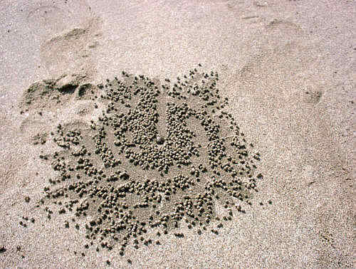 Das Touristenzentrum Kuta hat einen gefährlichen Strand wegen der großen Wellen. Alerdings kann man in den Wellen baden - ein Paradis für Server. Kleine Tiere "bauten" eine Musterlandschaft: