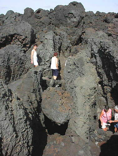 (Kochkessel, südlich von El Golfo) erstarrte Lava mit zwei großen Löchern, in denen sich das Meerwasser sammelt und bei großen Wellen mit Gewallt nach oben geschleudert wird |