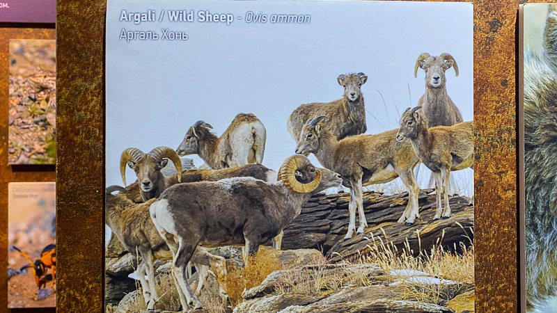 Informationstafeln über die Tierarten, die in der Wüste Gobi leben sowie die Informationen über die Gesteinsschichten der Roten Klippen.