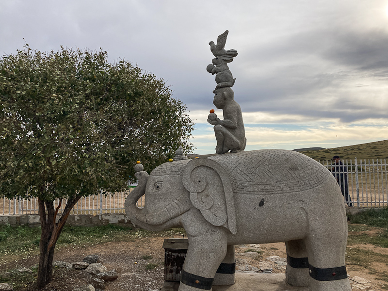 Auf der Fahrt zum nächsten Camp betrachteten wir im Süd-Changai eine eingezäunte Statue aus Stein, die einen Elefanten darstellt, auf dessen Rücken drei weitere Tiere übereinander sitzen; ein Affe, ein Hase und eine Taube. Bei der Darstellung handelt es sich um Figuren aus einem indischen Märchen.