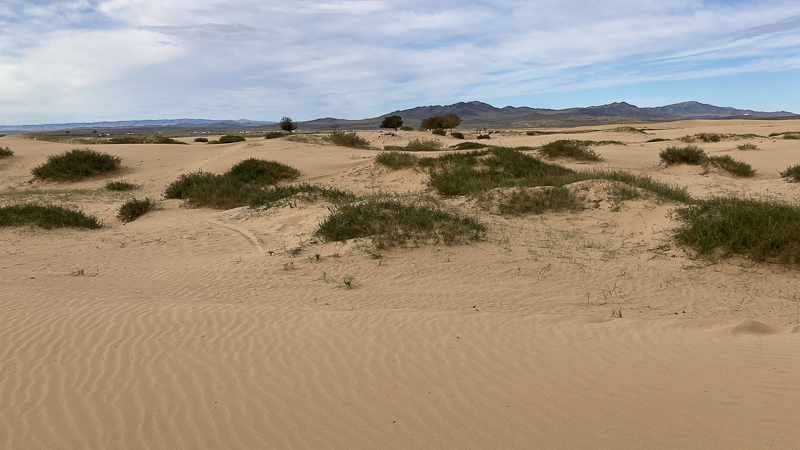 Die Sanddünen im Gebiet Elsen Tasarkhai sind wesentlich flacher als die Wanderdünen im Dünenfeld Khongoryn Els, das wir vor einigen Tagen kennenlernten. Von hier aus hat man einen weiten Blick in die Westmongolei.