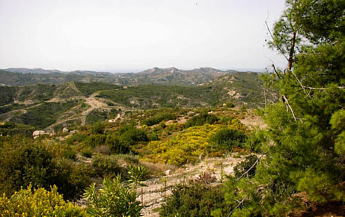 Blick von Kámiros in die Bergwelt der Insel. Die höchste Erhebung Atáviros ist 1 200 m.
